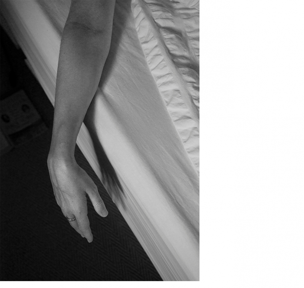 An arm rests on the edge of a bed, its own shadow leaking from the wrist to the mattress below. The live fingers and their inky silhouettes inch forward as if cautiously reaching towards one another.