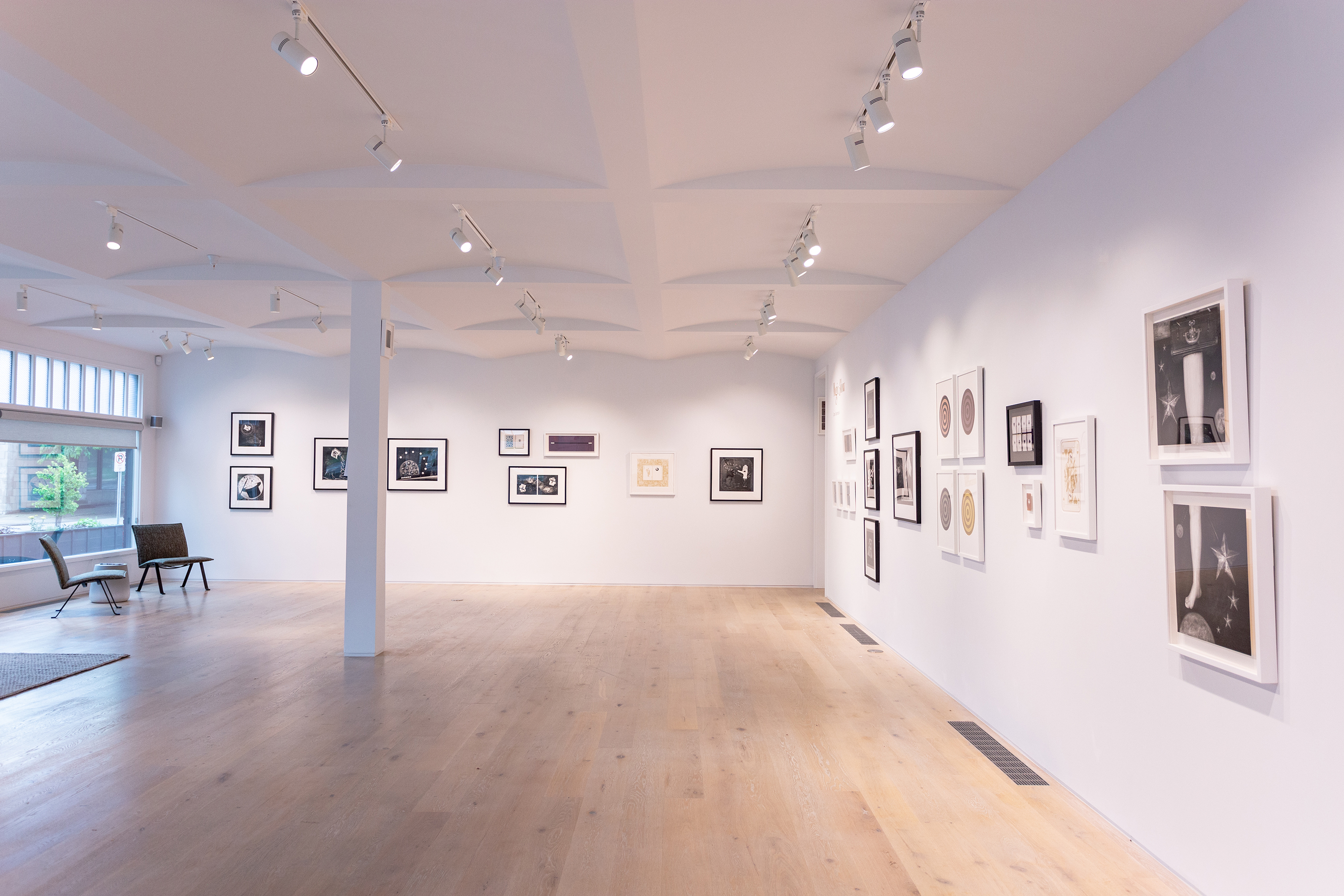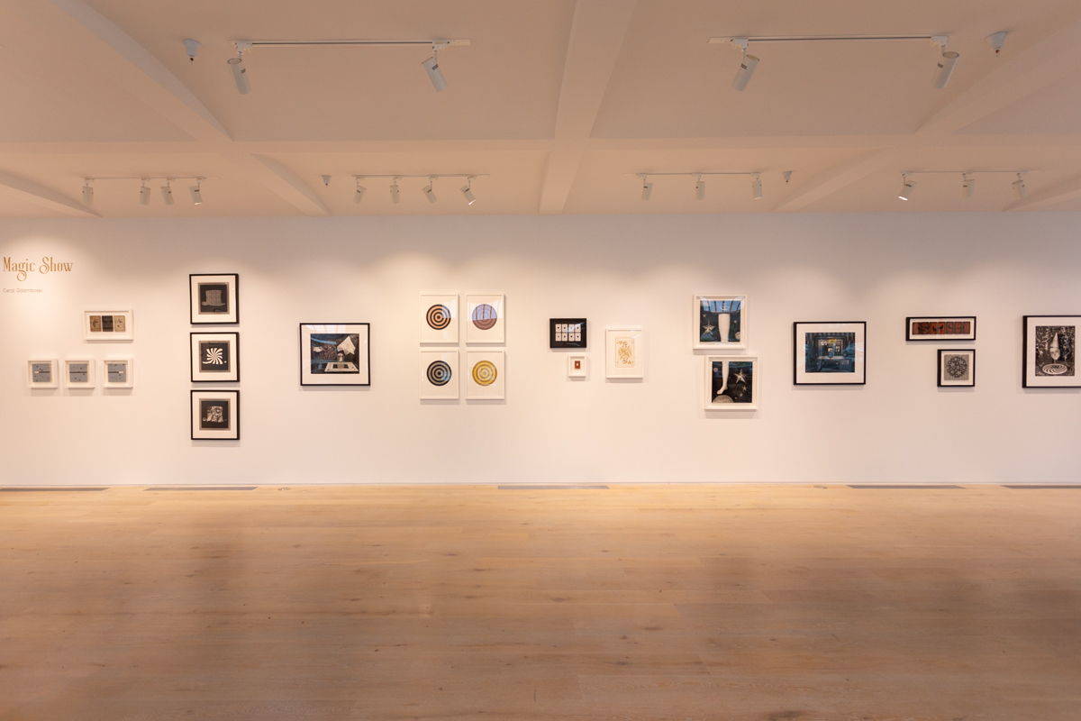 Magic holds its own particular aesthetic, one of stars, wands, and hypnotic lines. The cast consists of two-dimensional royalty, court jesters, the seductive curves and points of clubs and spades. Golemboski’s Magic Show rolls out a large number of pieces, unfurling like a scroll along the wall. They keep your attention, keep your eyes roving and searching, keep you from making too much sense of any one thing.