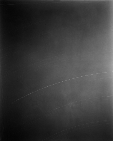 In Katseff’s Whole Night series, stars and other artifacts are traced on film, as if by a needle. They are surprising in their delicacy. Like careful, sophisticated etchings, they are light to the touch and create a subtle, orderly kind of poetry. These are photography-specific openings of wonder, because each one is an entire night, a full stretch of time collapsed into one, minimal image. The paths of many stars create points of intersection that may not have even happened in real time but are there recorded in the photograph. Although careful and meticulous in his processes, Katseff eventually releases control, allowing the sky to collaborate as an author. In this sense, the sky is an architect, plotting out its elegant blueprints of the night.