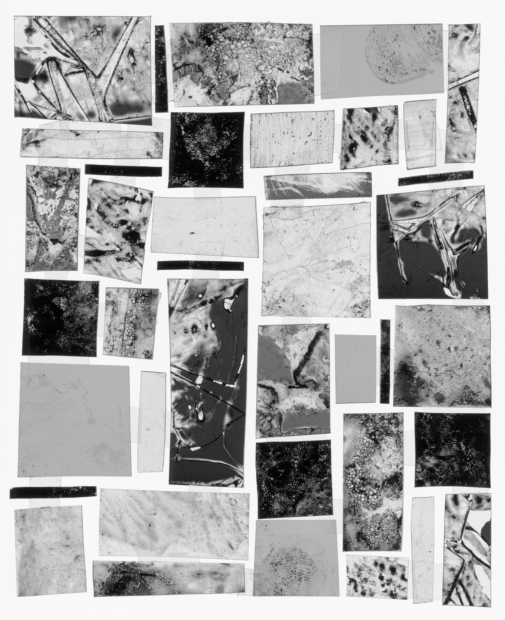 In 2013, I discovered a unique cameraless photographic process on black and white negative film. This process acts as a sort of etching on the film emulsion using saliva and the result leaves behind only metallic silver from the emulsion and biologic matter – on top of which I use marking-making to paint, scratch, or cut away portions of the negative. I find this process to be uniquely qualified to address my questions, experiences, and research as a person of color. This process produces a series of images that simultaneously reveal certain truths in my experiences surrounding identity as well as the inadequacies of language to describe oneself. Resembling systems of the natural sciences—microscopic, topographic and celestial—the photographs allegorize the complexity of systems that make up an individual and the perception of self. Over time, I have come to view these pieces as a kind of self-portraiture – one that does not show you what I look like but one that is built from my DNA and shaped by my experiences.
