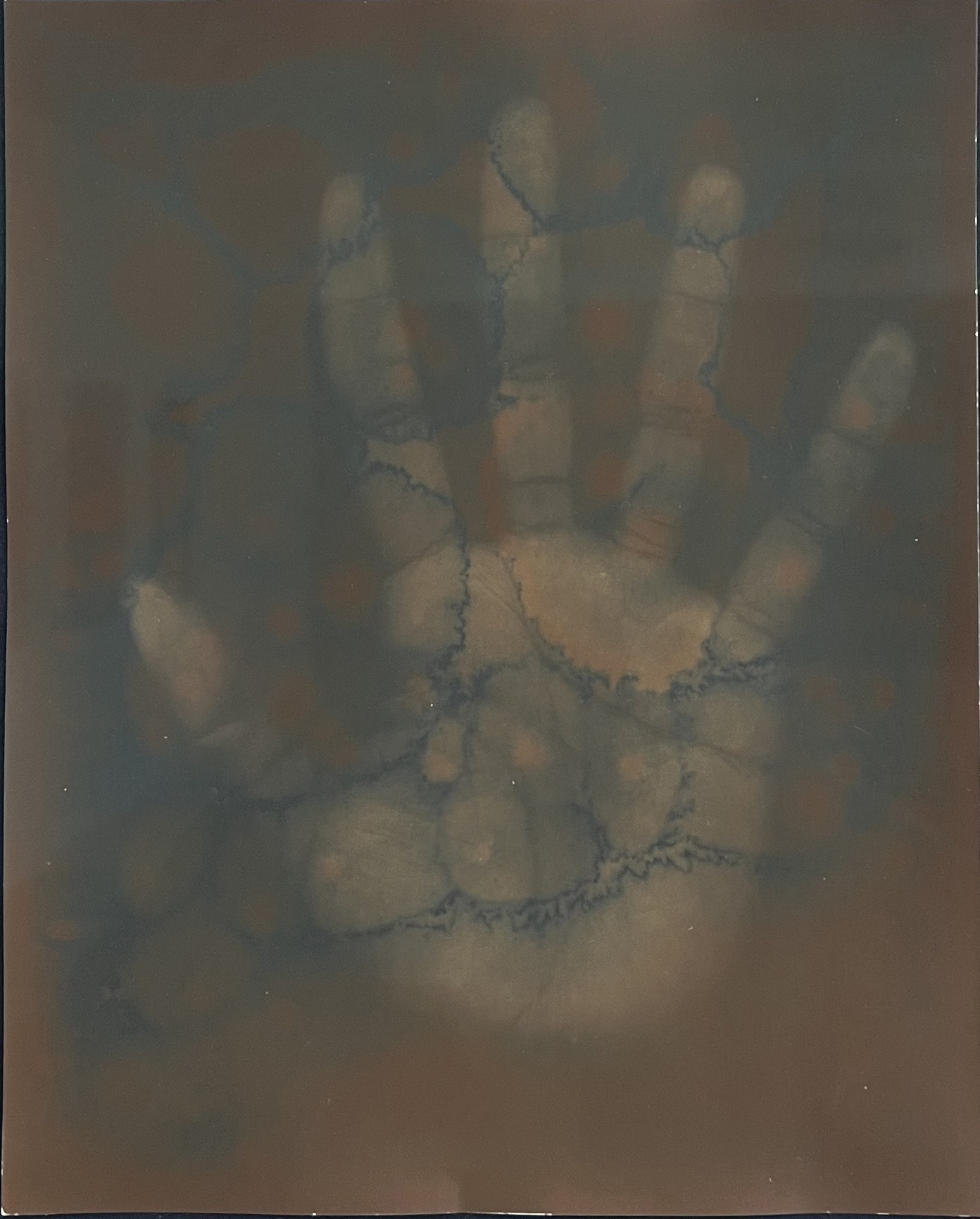 For this series, I use a process closely related to the process in use at the birth of the medium. The images for this work are in conversation with Daguerre and Talbot with the goal of placing a metaphorical asterisk in the photography history books. The annotation would point to photography’s relation to race and racism in American culture. Christina Sharpe argues in her book, In the Wake: On Blackness and Being, that a mode of “black annotation and black redaction” is needed to create a space for “ethical viewing and reading practices,” free from the traps of settler colonial violence. I intended this work to push back against the white gaze’s need for easily digestible otherness. My body became the site for a practice of “black annotation and redaction.” The series asks viewers to look deeper by purposely deemphasizing my body with various dark tones and colors. My body is not easily consumed in this work. I used the lumen printing process because the way images are rendered on the surface of the prints creates a shroud that forces the viewer to investigate at close range.