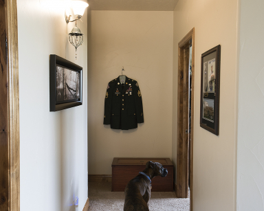 There is a knock on the door that military families hope to never receive. Notifiers arrive in pairs; one chaplain and one officer are tasked with bearing the most difficult news. Abergil has included their perspective, with large unflinching portraits that are interspersed between the family stories. Their bodies are poised in formal dress uniforms, but sorrow reflects back from their eyes. The images ask us to confront the faces that no parent wants to see. In the gallery, these portraits are larger than life size, as inescapable as the news they bear.