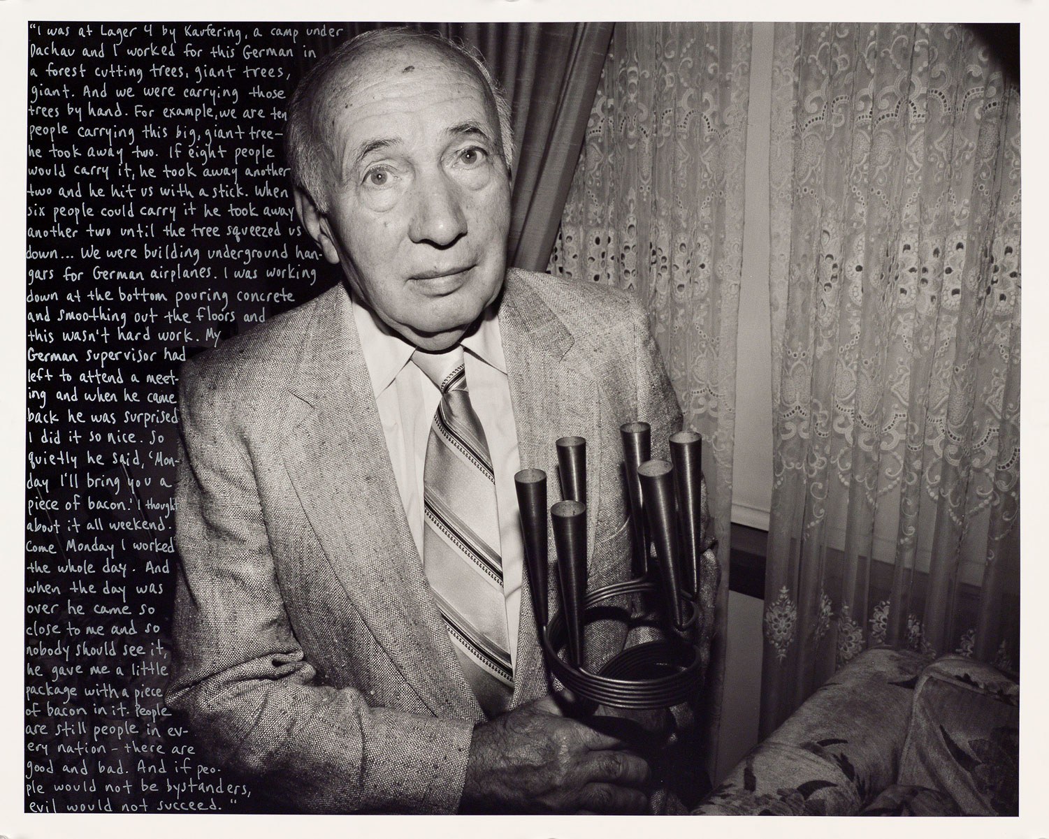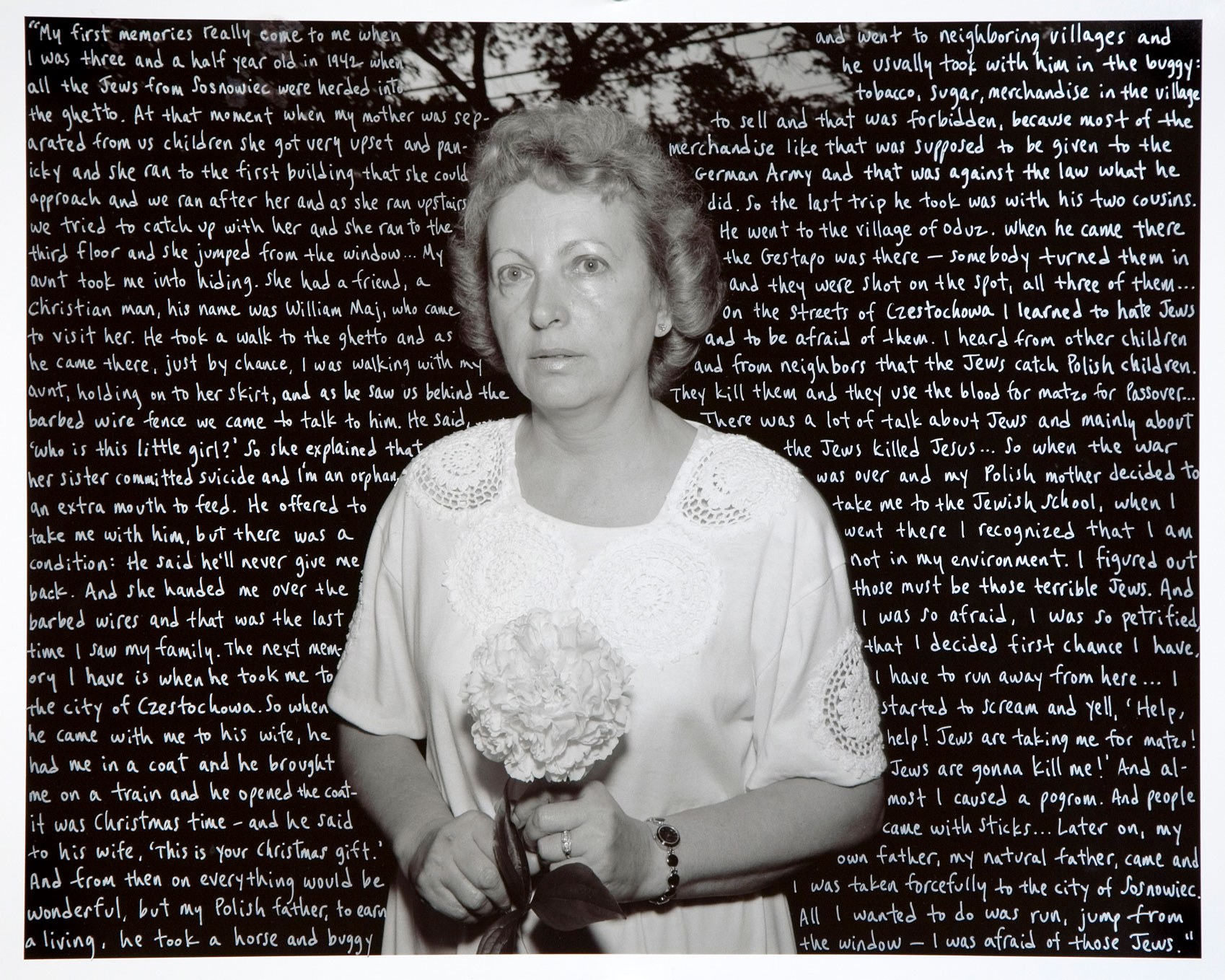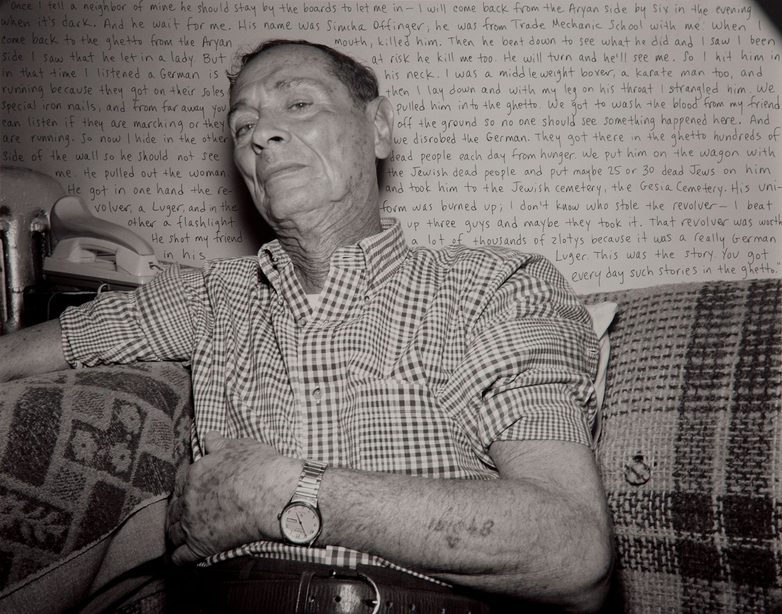 Throughout his prolific career, Jeffrey Wolin has chosen to look directly at hard truths and difficult histories. His photographs are in sharp focus, often with stark, direct light; they speak about memory, but they are not romanticized. The images sometimes put you uncomfortably close to the subject. In Wolin’s portrait of holocaust survivor, Mieczyslaw Weinberg, the text pushes in and down and around the man. As the words float in the space around his head, they hum and vibrate and seem to be part of the atmosphere itself, as if these histories- stories with such gravity, take up all the air in the room.
