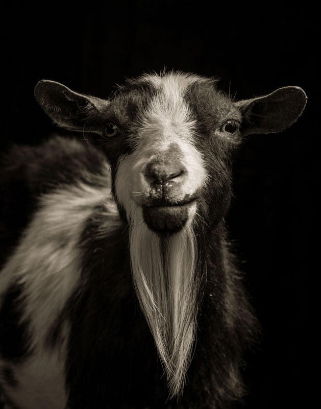 Treated as portrait subjects, they seem to have personalities. Perhapsthey do, and the photograph allows us to see them. Or perhaps the language of the photo cues us to generate the impression of a personage. One wonders if that interplay is any different here than it is in pictures of humans. This is a work about portraiture: what it does and how it works. I’ve made portraits of people for manyyears, and the chemistry of it is still mysterious. I am used to telling subjects that a good portrait is collaboration between photographer and subject. But how do you collaborate with a goat? A goat you’ve just met?