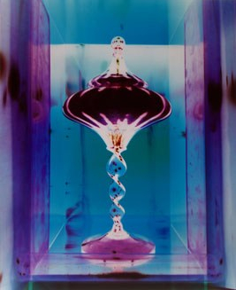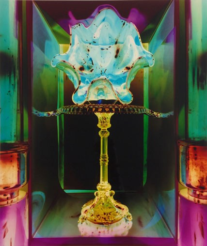 In my process, color paper is exposed to nearly an hour of varied light in excess of 20,000 watts. (The f/stop equivalent of the pinhole is f/958, a tiny opening requiring prolonged exposure for the paper to record an image and achieve rich saturation.) The process is somewhat of a performance as I move objects, change and shift lighting, and dodge and burn by casting shadows or funneling light to a selected spot to control density. Though I am moving too quickly to be recorded in any discernible way, I am, so to speak, a part of every image.